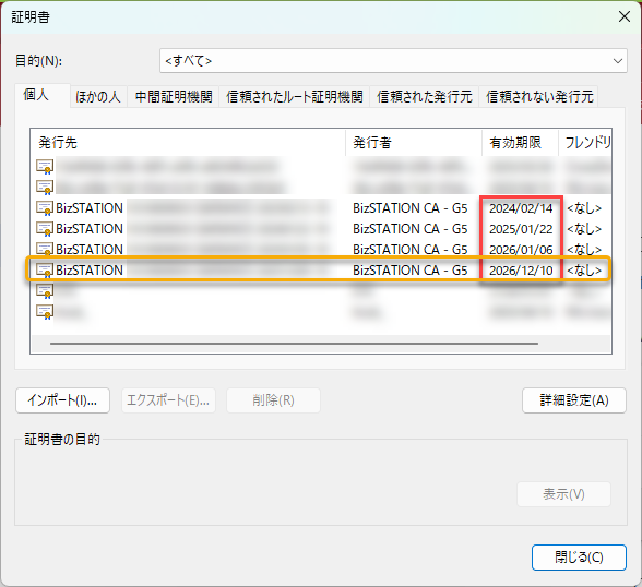 5. Windows証明書ストアが開き、「個人」タブに証明書一覧が表示されます